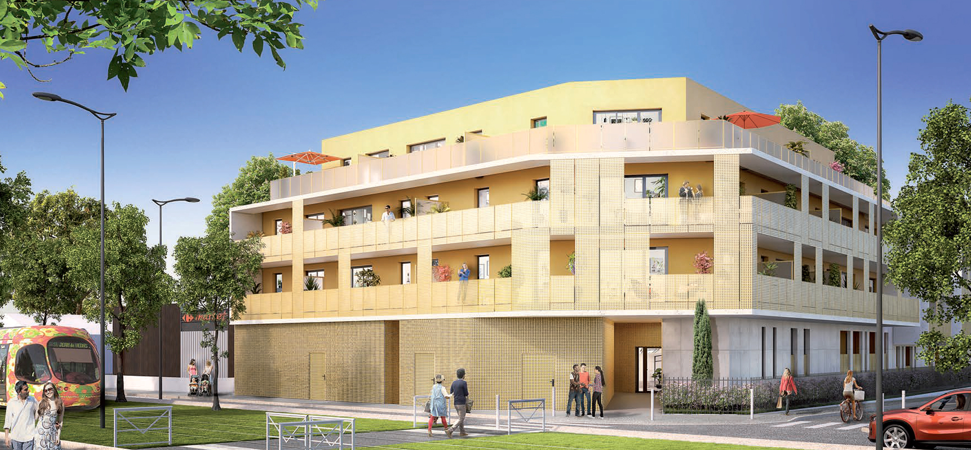 Les façades s’illuminent dans une variation d’enduits jaunes ensoleillés, s’imposant ainsi naturellement dans l’environnement arboré alentour. Un ouvrage en double peau habillé en résille apporte aux terrasses intimité et protection, tout en laissant passer la lumière jusqu’à l’intérieur des appartements. Côté impasse des Géraniums, une frange végétale isole le bâtiment de la rue dans l’esprit des jardins anglais. Les parkings sont en sous-sol préservant le calme des résidents.